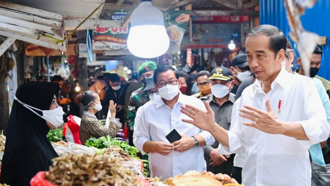 Di sana, Presiden menyapa sekaligus menyerahkan bantuan sosial kepada para pedagang pasar dan pedagang kaki lima (PKL).