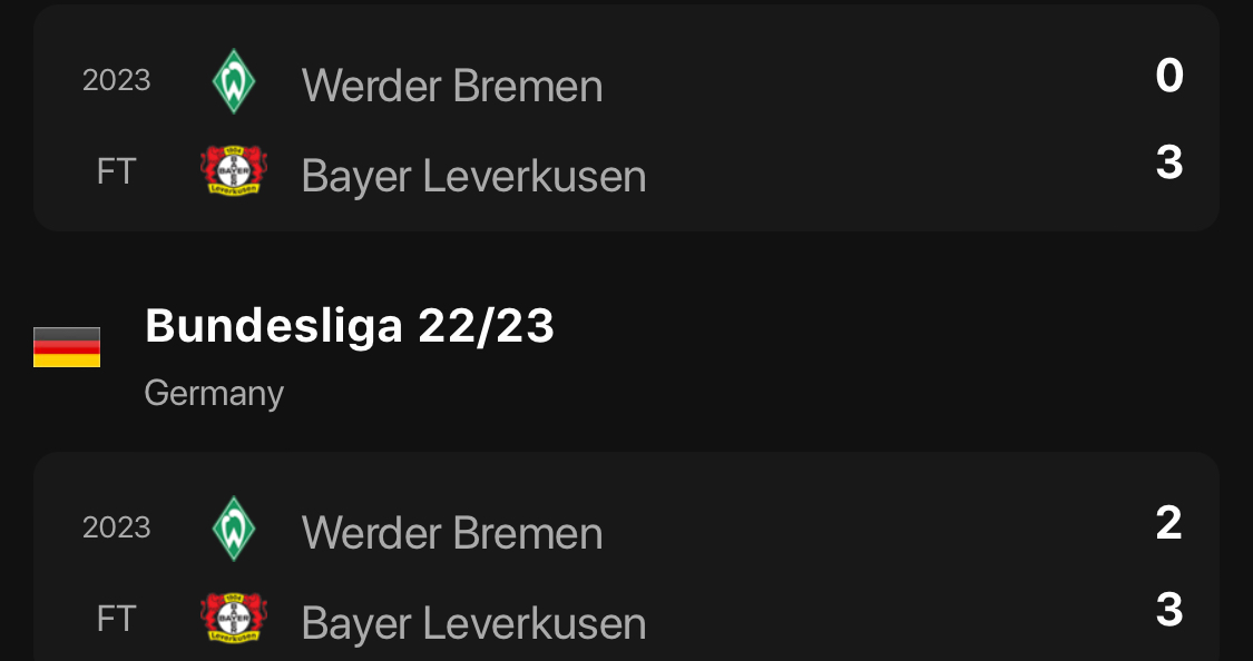Dalam pertemuan head-to-head sebelumnya antara Bayer Leverkusen dan Werder Bremen di Bundesliga, Leverkusen telah memenangkan kedua pertandingan dengan skor akhir 0-3 dan 2-3.