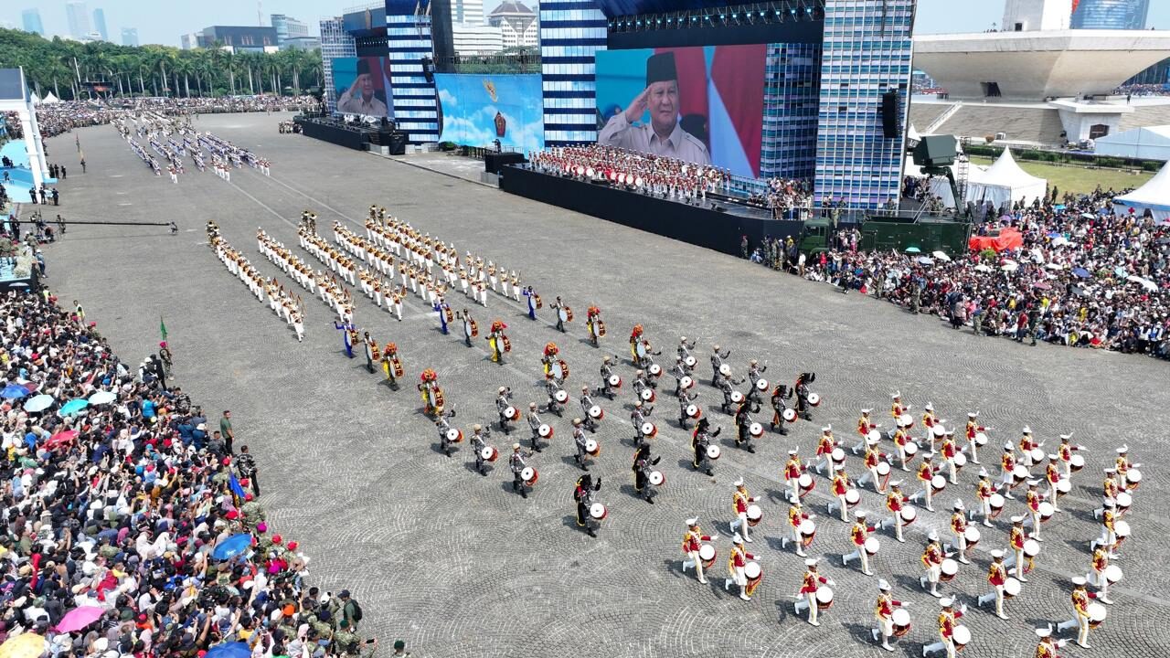 Dari mimbar kehormatan, Presiden Prabowo tampak serius memperhatikan setiap manuver yang ditampilkan prajurit dari tiga matra TNI. Monas seketika berubah menjadi panggung kolosal yang memadukan kekuatan darat, laut, dan udara.