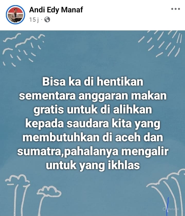 “Bisa ka di hentikan sementara anggaran makan bergizi gratis untuk di alihkan kepada saudara kita yang membutuhkan di aceh dan sumatera, pahalanya mengelarir untuk yang iklas” ujar Andi Edi Manaf di kutip dari starus FBnya pada Jumat, 19/12/2025.