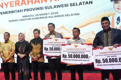 Penghargaan tersebut diserahkan langsung oleh Gubernur Sulawesi Selatan Andi Sudirman Sulaiman bersama Wakil Gubernur Fatmawati Rusdi dalam acara silaturahmi dan penyerahan apresiasi yang digelar di Rumah Jabatan Gubernur Sulawesi Selatan.