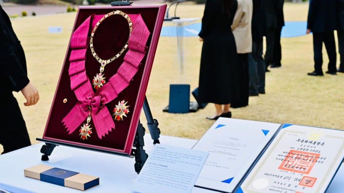 Penghargaan tersebut diserahkan langsung oleh Presiden Republik Korea Lee Jae Myung di Garden of Sangchungjae sebagai bagian dari rangkaian kunjungan kenegaraan Prabowo ke negara tersebut.