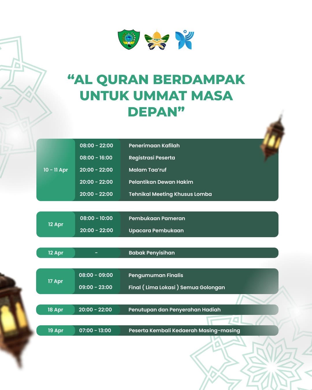Malam penutupan sekaligus penyerahan hadiah akan berlangsung pada 18 April 2026, dan seluruh peserta dijadwalkan kembali ke daerah masing-masing pada 19 April 2026.